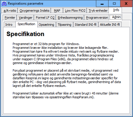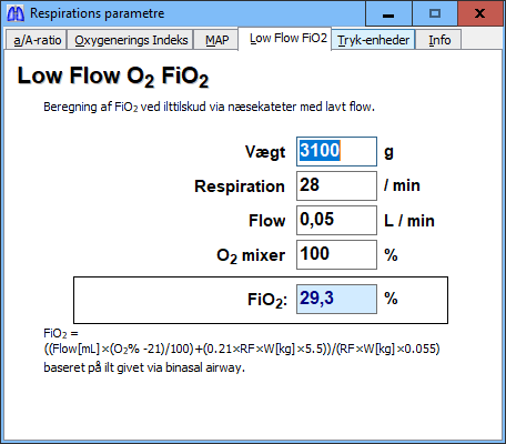 Program for beregning af diverse neonatale respirationsparametre: a/A-ratio, oksygenerings-indeks, mean airway pressure ved mekanisk ventilation, FiO2 ved O2-tilførsel via nasal-kateter med lavt flow: "Low Flow O2" (0,025 - 0,2 L/min).